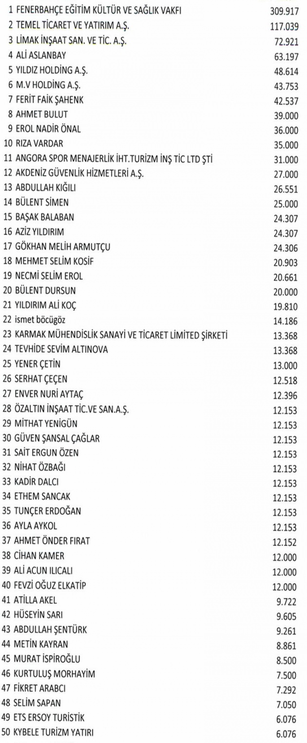 Fenerbahçe Eğitim Vakfı, yaklaşık 13 milyon lira ile en çok hisse alan kurum oldu. Deniz Yatırım da 7 milyon liralık hisse aldı. ESMEDYA Yönetim Kurulu Başkanı Ethem Sancak da Fenerbahçe Kulübü'den 12 bin 153 lot hisse aldı.