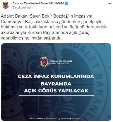Ceza ve Tevkifevleri Genel Müdürlüğü resmi sosyal medya hesabından yapılan paylaşımda, “Adalet Bakanı Sayın Bekir Bozdağ’ın imzasıyla Cumhuriyet Başsavcılıklarına gönderilen genelgeyle, hükümlü ve tutukluların, aileleri ve üçüncü derecedeki akrabalarıyla Kurban Bayramı’nda açık görüş yapabilmesine imkân sağlandı” ifadelerine yerildi.
