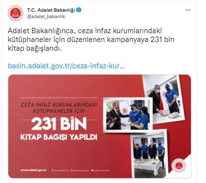 Ceza infaz kurumundaki tutuklu ve hükümlülere okuma alışkanlığı kazandırmak ve farkındalık oluşturmak amacıyla Adalet Bakanlığınca Türkiye genelinde düzenlenen Kitap Bağış Kampanyasına 231 bin 627 kitap bağışı yapıldı.