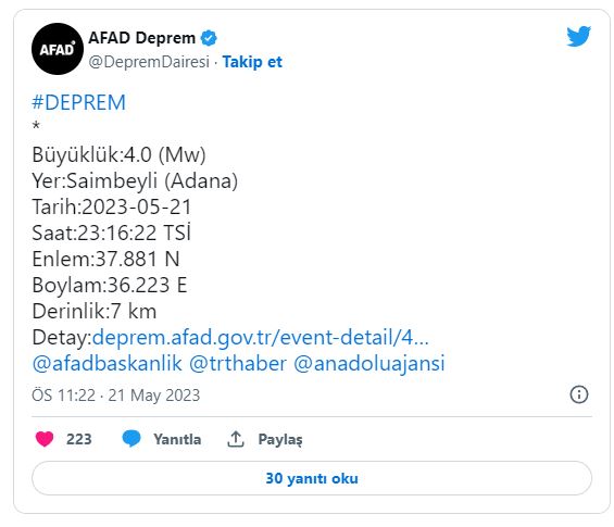 Afet ve Acil Durum Yönetimi Başkanlığından (AFAD) alınan bilgiye göre, saat: 23.16'da Adana'nın Saimbeyli ilçesinde 4.0 büyüklüğünde deprem meydana geldi. Yerin 7 kilometre derinliğinde meydana gelen deprem ilçe ve yakın çevresinde hissedildiği bildirildi. Aynı bölgede öğle saatlerinde 4.9 büyüklüğünde deprem meydana gelmişti.