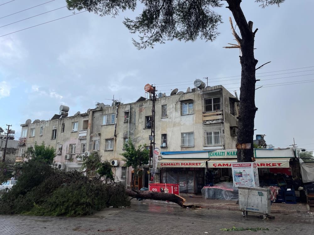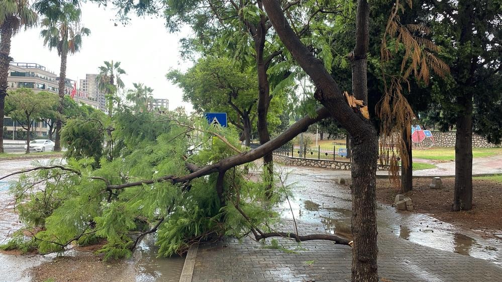 Kısa süren yağmur ve rüzgar özellikle merkez Çukurova ilçesinde ortalığı savaş alanına çevirdi. Kökünden sökülen bazı ağaçlar yollarda sürüklendi.