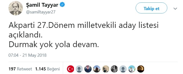 Listede yer alamayan Şamil Tayyar "Akparti 27.Dönem milletvekili aday listesi açıklandı. Durmak yok yola devam." dedi.
