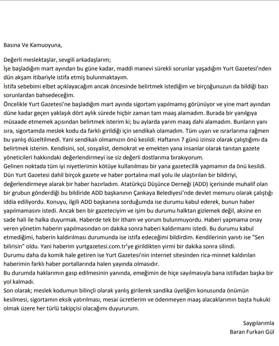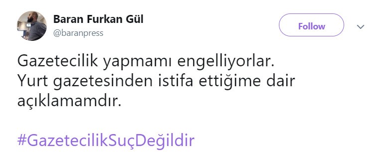 Baran Furkan Gül, sosyal medyadan yayımladığı açıklamasında gazetecilik faaliyetinin engellendiğinin altını çizerek istifa etti.