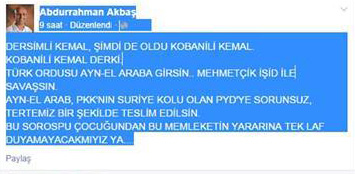 “Dersimli Kemal şimdi de oldu Kobanili Kemal. Kobanili Kemal der ki;