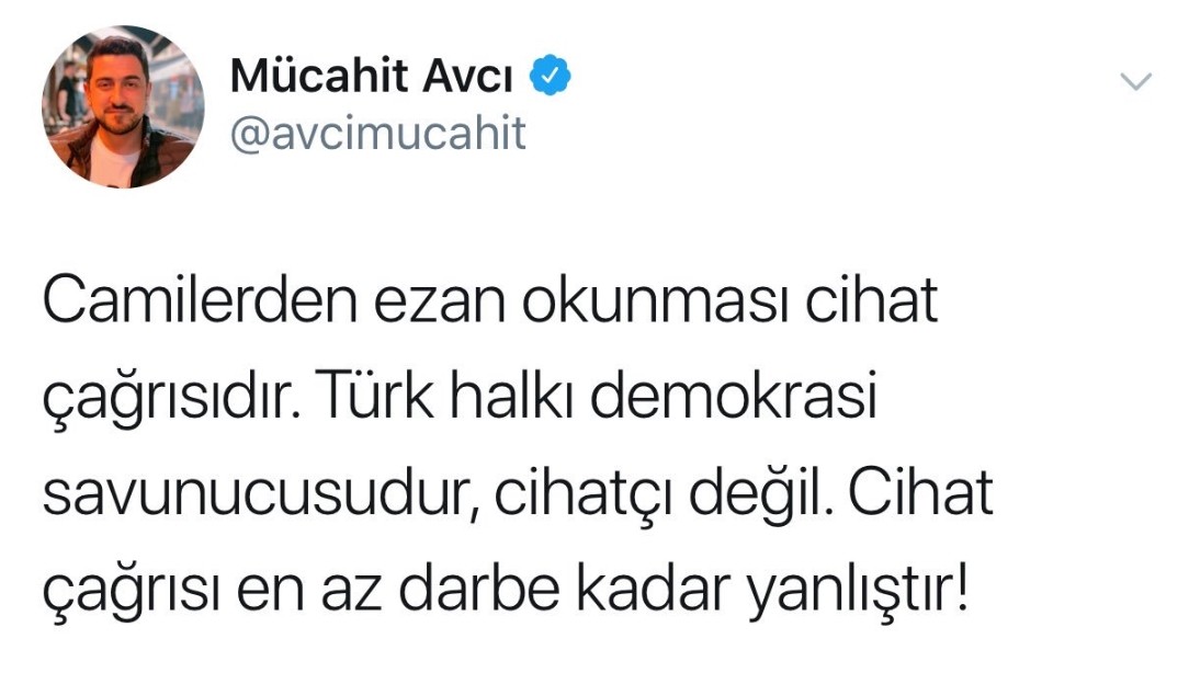 CHP’nin 23 Haziran seçimleri için görevlendirdiği sosyal medya danışmanı Mücahit Avcı’nın sosyal medya hesapları üzerinden yaptığı din ve devlet düşmanı paylaşımları ortaya çıktı. CHP'li Avcı, 15 Temmuz gecesi "Camilerde ezan okunması cihat çağrısıdır. Türk halkı demokrasi savunucusudur, cihatçı değil" tweetini atmış.