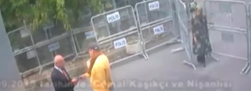İstanbul'daki Suudi Arabistan Başkonsolosluğu'n boğazı kesilerek öldürülen ve cesedi parçalara ayrılan gazeteci Cemal Kaşıkçı'nın konsolosluğa girerken yeni görüntüleri ortaya çıktı. Görüntülerde sarı kazaklı olan Cemal Kaşıkçı'nın hemen yanında nişanlısı Hatice Cengiz de var.