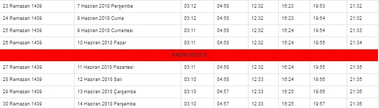 ADANA DİYANET 2018 RAMAZAN İMSAKİYESİ İFTAR VE SAHUR VAKİTLERİ