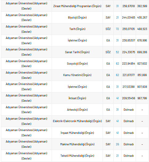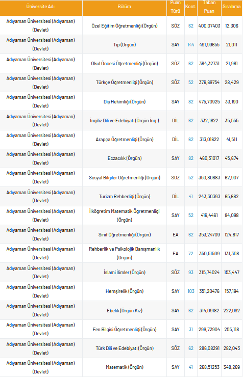 Adıyaman Üniversitesi 4 yıllık taban puanları 2021, yüzdelik dilimleri ve kontenjan sayıları kaçtır?