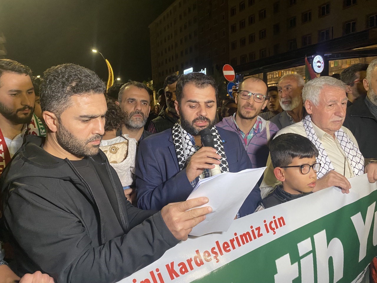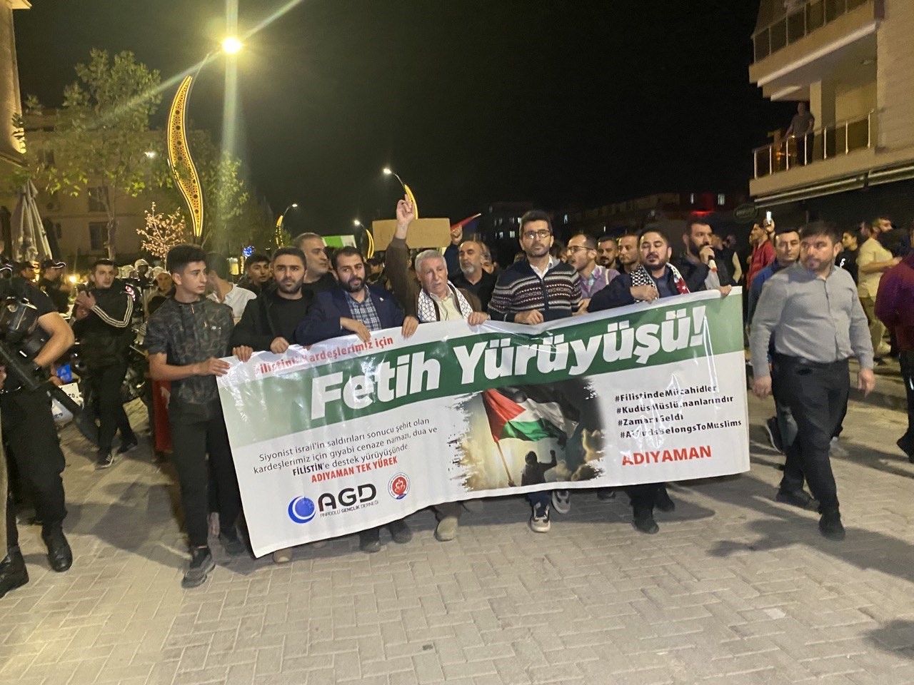 Yürüyüşte Filistin ve Türk bayrakları taşıyan grup, İsrail’e karşı sloganlar attı. Anadolu Gençlik Derneği Adıyaman Şube Başkanı Mehmet Gezici yaptığı açıklamada, "Dünyanın gözü önünde soykırım yaşanıyor. Her fırsatta insan haklarından dem vuran batı ve Amerika, tüm dünyanın gözleri önünde işlenen İsrail terörizmine hiçbir zaman karşı çıkmamıştır. Şimdi de bütün yüzsüzlükleriyle Filistin’e karşı insan haklarını ihlal ediyorsunuz saldırıları durdurun çağrısı yapıyorlar. Fakat onlara karşı biz Kudüs’ün Mescidi Aksa'nın özgürlüğüne giden yolda Filistinli kardeşlerimizle ve mücahitlerle omuz omuza olduğumuzu haykırmak için buradayız” diye konuştu.