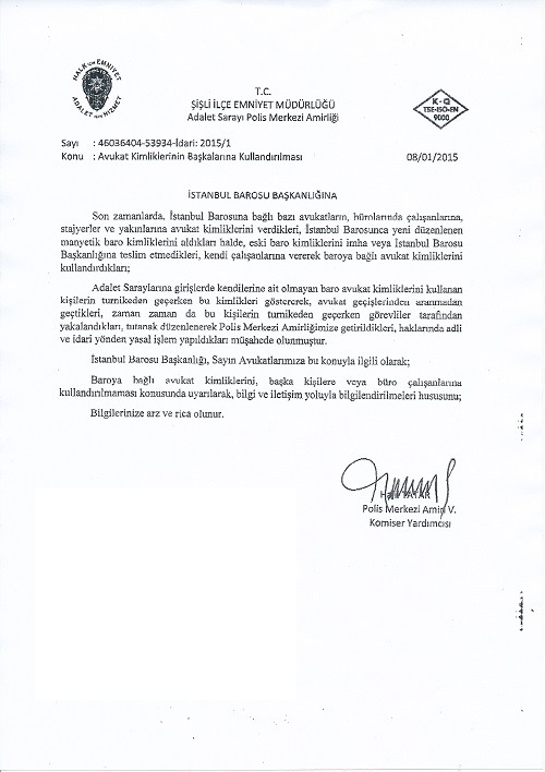 Yazının devamında, İstanbul Barosu'nun, kimliklerini başka kişilere kullandırılmaması konusunda avukatlara uyarıda bulunması istendi.