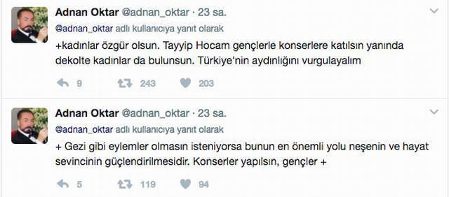 Adnan Oktar Twitter hesabından Cumhurbaşkanı Recep Tayyip Erdoğan'a ahlaksız bir çağrıda bulundu. Gezi kalkışması gibi olayların yaşanmaması için gençlerin katıldığı konserlerin yapılması gerektiğini savunan Oktar, "Tayyip Hocam gençlerle konserlere katılsın yanında dekolte kadınlar da bulunsun" ifadelerini kullanarak Erdoğan'a ahlaksız bir teklifte bulundu. Hızını alamayan Oktar, "Dekolteye saygı hükümetin birinci önceliği olmalı" diyerek sınırları aştı. Duyarlı Müslümanlar Oktar'ın skandal sözlerine büyük tepki gösterdi.