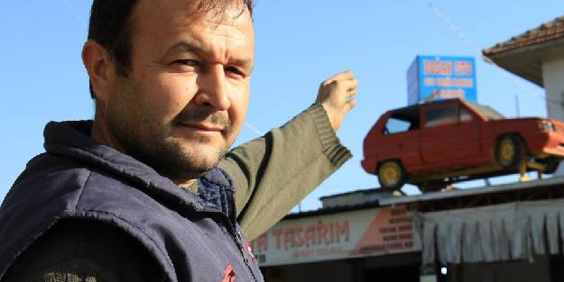 Erdemli ilçesi Tömük Mahallesi’nde 20 yıldır oto tamircilik yapan Mehmet Şahin Doğan, kendisi ile kardeşinin 7, komşularının ise 4 yıl kullandığı otomobili çatıya çıkarıp hem adres tarifi hem de tabela olarak kullanmaya başladı. 4 yıl önce vinç yardımı ile iş yerinin çatısına çıkartılan 28 yaşındaki otomobil hem yoldan geçenlerin dikkatini çektiği, hem de adres tarifi için kolaylık sağladığı belirtildi.