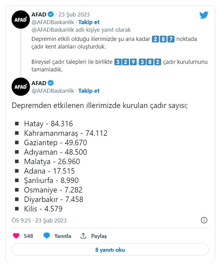 Depremin etkili olduğu illerimizde şu ana kadar 287 noktada çadır kent alanları oluşturduk. Bireysel çadır talepleri ile birlikte 329 bin 382 çadır kurulumunu tamamladık.