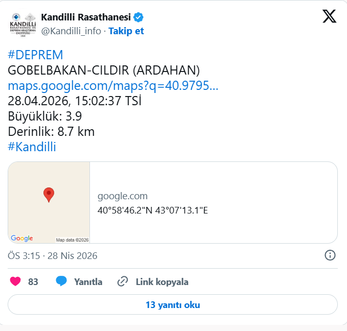 Boğaziçi Üniversitesi Kandilli Rasathanesi ve Deprem Araştırma Enstitüsü, Ardahan'ın Çıldır ilçesi merkezli 3.9 büyüklüğünde bir depremin meydana geldiğini açıkladı.