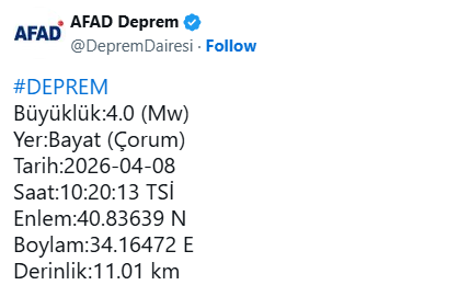 İçişleri Bakanlığı, Afet ve Acil Durum Yönetimi Başkanlığı (AFAD), tarafından bugün Çorum'un Balat ilçesi merkezli 4 büyüklüğünde bir depremin meydana geldiği açıklandı.