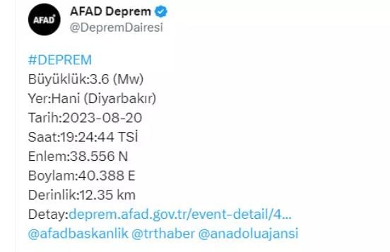 AFAD, Diyarbakır'ın Hani ilçesinde 3,6 büyüklüğünde depremin meydana geldiğini açıkladı.