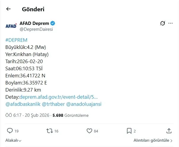 AFAD, Hatay'ın Kırıkhan ilçesinde sabah saatlerinde 4.2 büyüklüğünde bir depremin meydana geldiğini duyurdu. Yer sarsıntısı çevre illerden de hissedilirken kısa süreli paniğe yol açtı.