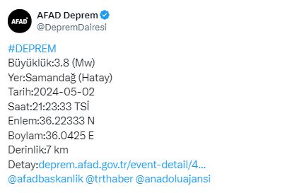 AFAD, Hatay'ın Samandağ ilçesinde 3,8 büyüklüğünde deprem meydana geldiğini açıkladı.