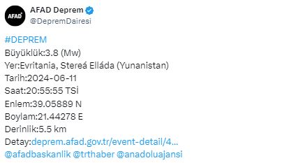 AFAD, Yunanistan'ın Evritania bölgesinde bir depremin meydana geldiğini duyurdu.
