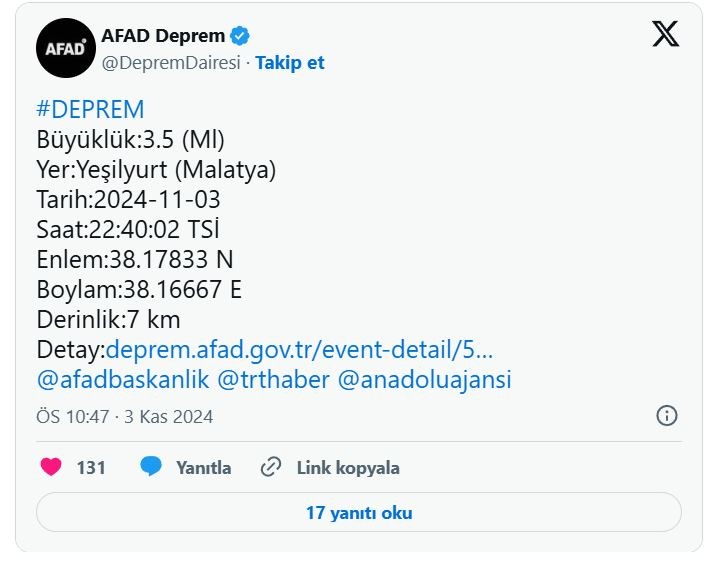 Malatya'da 3.5 büyüklüğünde korkutan meydana oldu. Depremi AFAD son dakika olarak duyurdu. Deprem saat 22.40 sularında oldu ve yerin 7 kilometre derinliğinde meydana geldi.