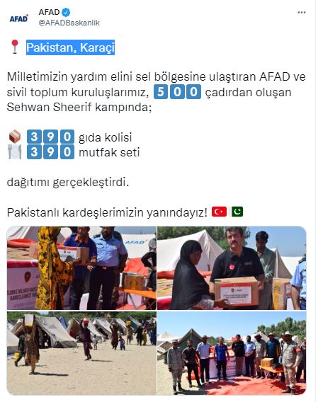 Afet ve Acil Durum Yönetimi Başkanlığı (AFAD) tarafından yapılan açıklamada şu ifadelere yer verildi; “Milletimizin yardım elini sel bölgesine ulaştıran AFAD ve sivil toplum kuruluşlarımız, 500 çadırdan oluşan Sehwan Sheerif kampında; 390 gıda kolisi, 390 mutfak seti dağıtımı gerçekleştirdi. Pakistanlı kardeşlerimizin yanındayız!”