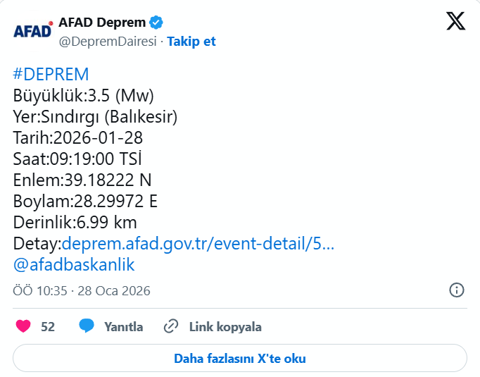 İçişleri Bakanlığı Afet ve Acil Durum Yönetimi Başkanlığı Deprem Dairesi Başkanlığı (AFAD) Balıkesir'in Sındırgı ilçesinde 3,5 büyüklüğünde bir depremin meydana geldiğini açıkladı.