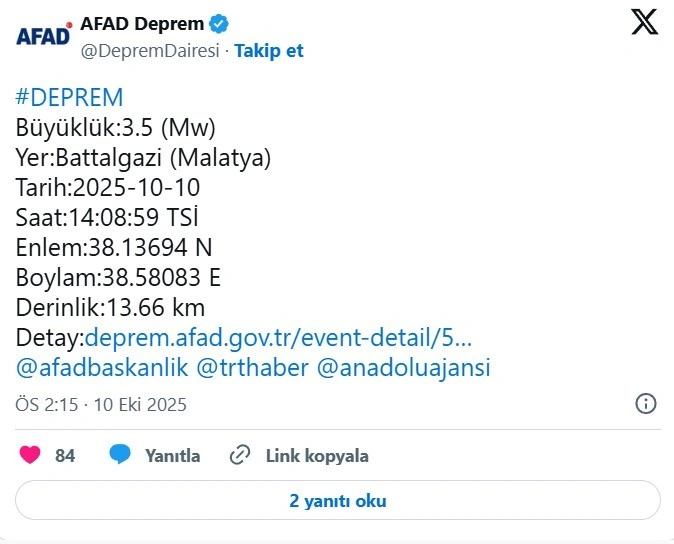İçişleri Bakanlığı Afet ve Acil Durum Yönetimi Başkanlığı (AFAD), Malatya'nın Battalgazi ilçesi merkezli 3,5 büyüklüğünde bir depremin meydana geldiğini açıkladı.
