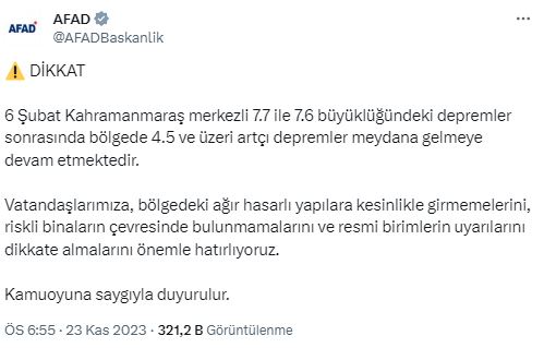 AFAD'ın sosyal medya hesabından paylaşılan mesajda, "6 Şubat Kahramanmaraş merkezli 7.7 ile 7.6 büyüklüğündeki depremler sonrasında bölgede 4.5 ve üzeri artçı depremler meydana gelmeye devam etmektedir." denildi.