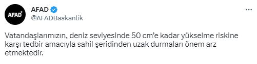 Afet ve Acil Durum Yönetimi Başkanlığı (AFAD), deprem bölgesinde vatandaşları deniz seviyesinde 50 santimetreye kadar yükselme riskine karşı sahil şeridinden uzak durmaları konusunda uyardı.