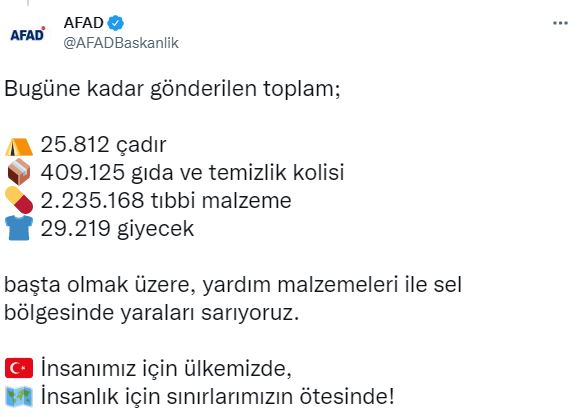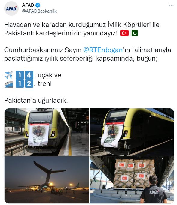 AFAD tarafından yapılan paylaşımda, “Havadan ve karadan kurduğumuz İyilik Köprüleri ile Pakistanlı kardeşlerimizin yanındayız! Cumhurbaşkanımız Sayın @RTErdogan’ın talimatlarıyla başlattığımız iyilik seferberliği kapsamında, bugün; 14 uçak ve 12 treni Pakistan’a uğurladık. Bugüne kadar gönderilen toplam; 25.812 çadır 409.125 gıda ve temizlik kolisi 2.235.168 tıbbi malzeme 29.219 giyecek başta olmak üzere, yardım malzemeleri ile sel bölgesinde yaraları sarıyoruz” ifadeleri kullanıldı.