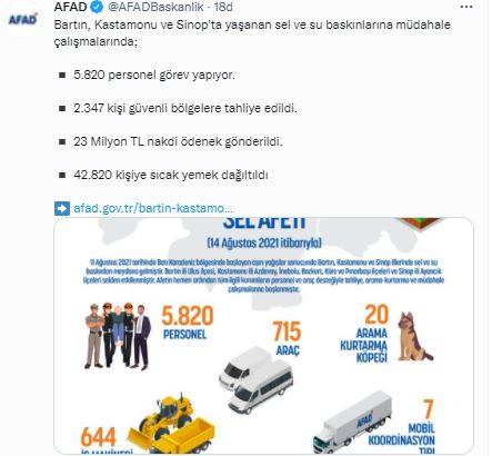 Afet ve Acil Durum Yönetimi Başkanlığı (AFAD) Bartın, Kastamonu ve Sinop'ta yaşanan sel ve su baskınlarına müdahale çalışmalarına ilişkin verileri paylaştı. Buna göre 5 bin 820 personel görev yapıyor. 2 bin 347 kişi güvenli bölgelere tahliye edildi. 23 Milyon TL nakdi ödenek gönderildi. 42 bin 820 kişiye sıcak yemek dağıltıldı.