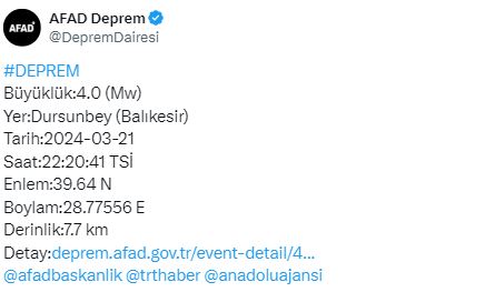Afet ve Acil Durum Yönetimi (AFAD) Başkanlığının internet sitesinde yer alan bilgiye göre, merkez üssü Dursunbey ilçesi olan 4 büyüklüğündeki sarsıntının 7,7 kilometre derinlikte meydana geldiği belirlendi.