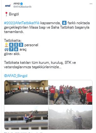 Afet ve Acil Durum Yönetimi Başkanlığı’ndan yapılan yazılı açıklamaya göre; “2022AfetTatbikatYılı kapsamında, 6 farklı noktada gerçekleştirilen Masa başı ve Saha Tatbikatı başarıyla tamamlandı. Tatbikatta; 453 personel, 76 araç görev aldı. Tatbikata katılan tüm kurum, kuruluş, STK ve vatandaşlarımıza teşekkürlerimizle…” denildi.