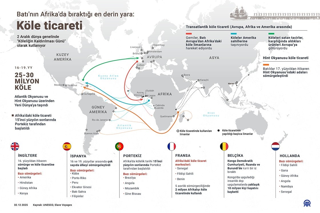 Batılı sömürgeci devletler, yaklaşık dört asır boyunca milyonlarca Afrikalıyı transatlantik köle gemileriyle zorla "Yeni Dünya" olarak adlandırdıkları Amerika kıtasına götürdü. Avrupa ve Amerika'dan kalkan gemiler, Benin, Gana, Senegal, Gambiya, Kongo, Nijerya ve Angola limanlarını köle ticareti merkezleri gibi kullanarak "Yeni Dünya"ya köle taşıdı. İşte Afrika’da derin yaralar bırakan, vicdansız Batı’nın köle haritası…