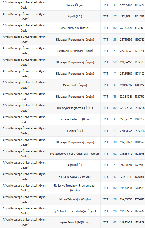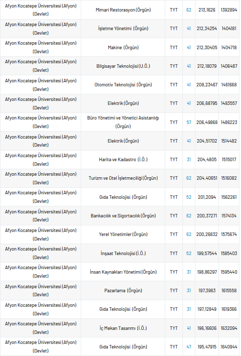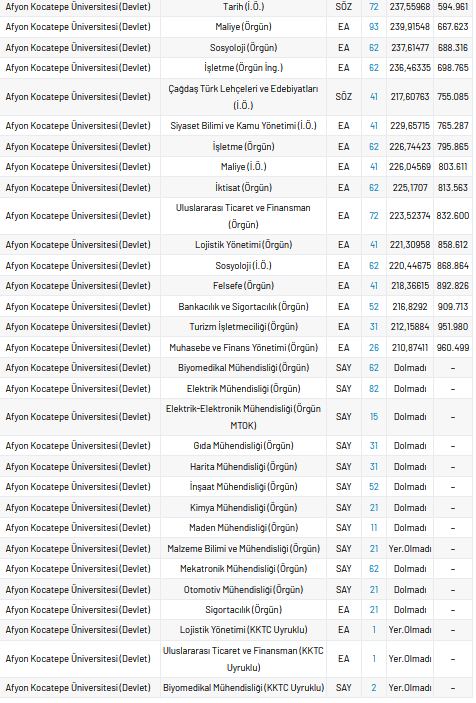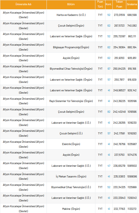 Her yıl yapılan YKS sınavına iki aydan az bir süre kaldı. Sınav heyecanını taşıyan öğrenciler bulundukları ildeki, üniversitelerin taban puan, yüzdelik ve kontenjan sayılarını araştırıyor. Peki, Afyon Kocatepe Üniversitesi taban puanı, en düşük yüzdelik, en yüksek yüzdelik ve kontenjan sayıları kaçtır?