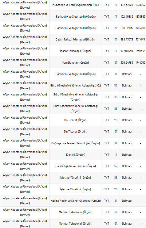 Afyon Kocatepe Üniversitesi 2 yıllık taban puanları 2021, yüzdelik dilimleri ve kontenjan sayıları kaçtır?