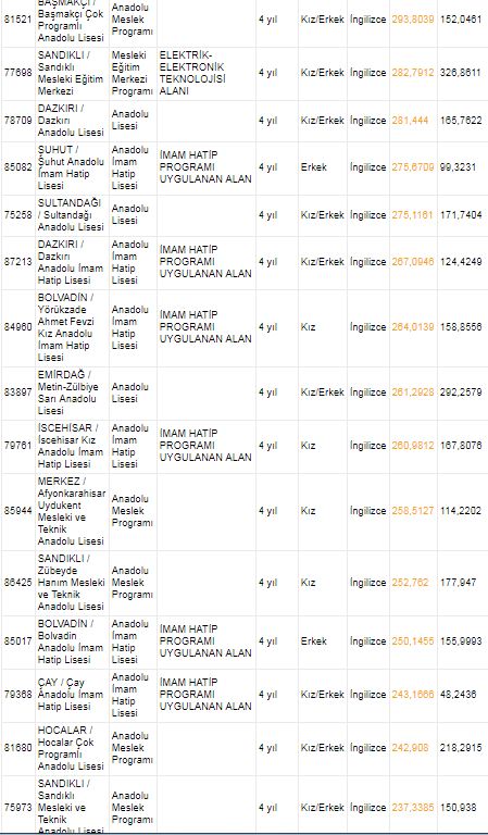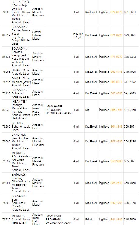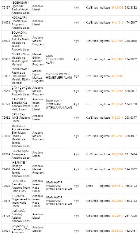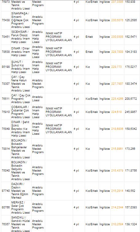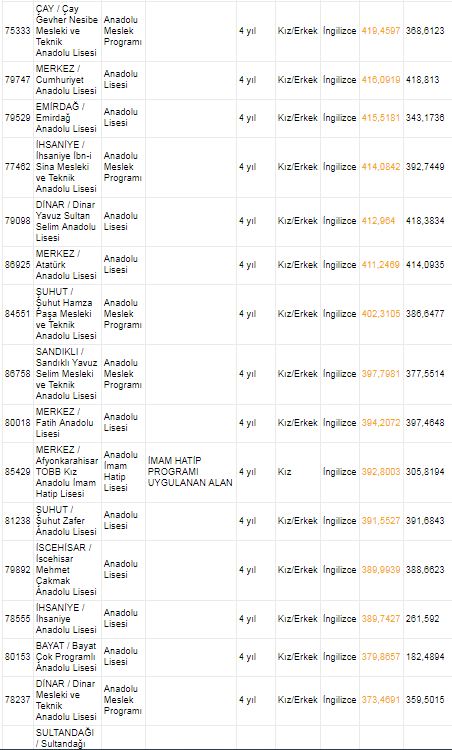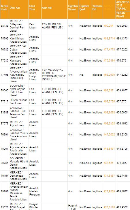 AFYONKARAHİSAR LİSELERİ 2018 TABAN PUANLARI VE KONTENJANLARI