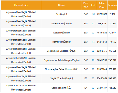 Afyonkarahisar Sağlık Bilimleri Üniversitesi 2021 taban puanları ve yüzdelik dilimleri