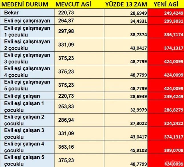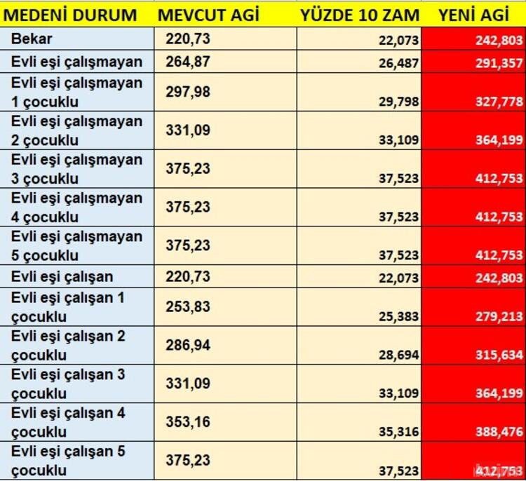AGİ ne kadar arttı? En düşük AGİ kaç para? soruları çalışanlar tarafından araştırılmakta. En düşük zam ihtimali yüzde 7 olması durumunda en az AGİ 236.1 lira en yüksek AGİ 401.4 lira olacak. Zam oranı yüzde 35 olursa en az AGİ 297.9 lira en yüksek AGİ 506.5 lira olacak. İşte Hürriyet'in haberine göre olası yeni AGİ ücretleri…