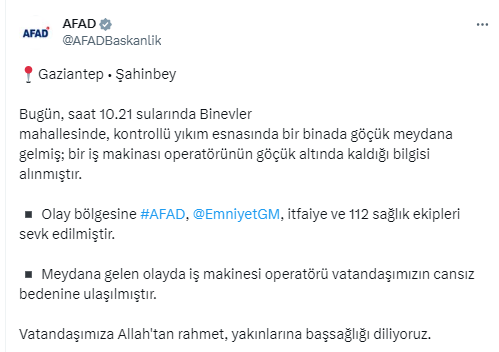 AFAD, sosyal medya hesabından acı haberi şu mesajla duyurdu: