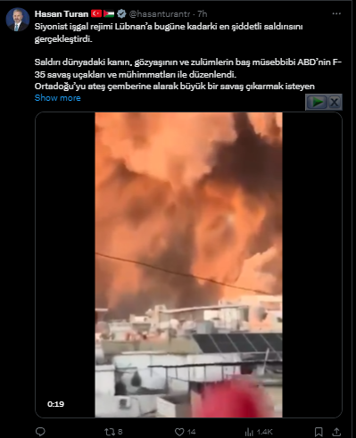 Ak Parti İstanbul Milletvekili ve Türkiye-Filistin Parlamentolar Arası Dostluk Grubu Başkanı Hasan Turan İşgalci İsrail’in Lübnan’ın başkenti Beyrut’a yaptığı saldırı sonrasında sosyal medya hesabından bir paylaşım yaptı. Turan, “Şayet ayrılıklar bir kenara bırakılıp birlikte hareket edilmezse Gazze ve Beyrut’taki ateş Bağdat’ı, Şam’ı, Kahire’yi de yakacaktır.” Dedi.
