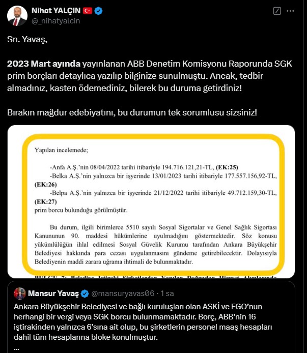 Mansur Yavaş’a cevap veren Ankara Büyükşehir Belediyesi AK Parti Grup Başkanvekili Nihat Yalçın ise Denetim Kurulu Raporu’nu paylaşarak, “Sayın Yavaş, 2023 Mart ayında yayınlanan ABB Denetim Komisyonu Raporunda SGK prim borçları detaylıca yazılıp bilginize sunulmuştu. Ancak, tedbir almadınız, kasten ödemediniz, bilerek bu duruma getirdiniz! Bırakın mağdur edebiyatını, bu durumun tek sorumlusu sizsiniz!” dedi.