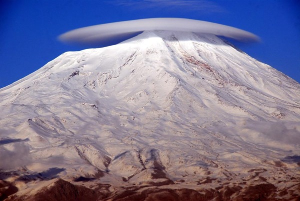 Doğubayazıt ilçesindeki Ağrı Dağı'nın doruğu dairesel bulutların oluşturduğu görüntüsü ile şaşırttı.