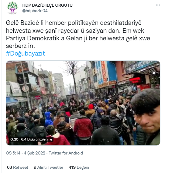 HDP'liler, sokak eylemini, "AK Parti'nin en çok oy aldığı Ağrı'da halk ayaklandı." ifadeleri ile duyurarak algı oluşturmaya çalıştı.