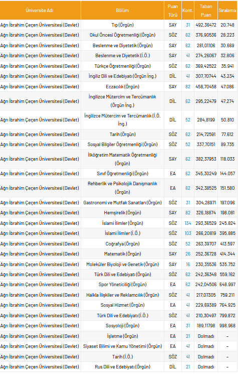 Ağrı İbrahim Çeçen Üniversitesi 2021 taban puanları ve yüzdelik dilimleri