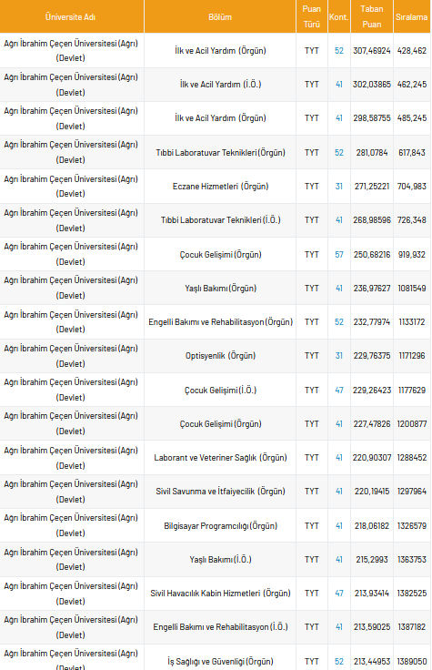 Üniversite taban puanları ve kontenjan sayısı öğrenciler tarafından yoğun ilgi görüyor. Hedefledikleri üniversiteye girebilmek için yoğun şekilde sınava hazırlanan öğrenciler internette üniversitelerin taban puanlarını ve kontenjan sayılarını araştırıyor. Peki, Ağrı İbrahim Çeçen Üniversitesi taban puanı, en düşük yüzdelik, en yüksek yüzdelik ve kontenjan sayıları kaçtır?