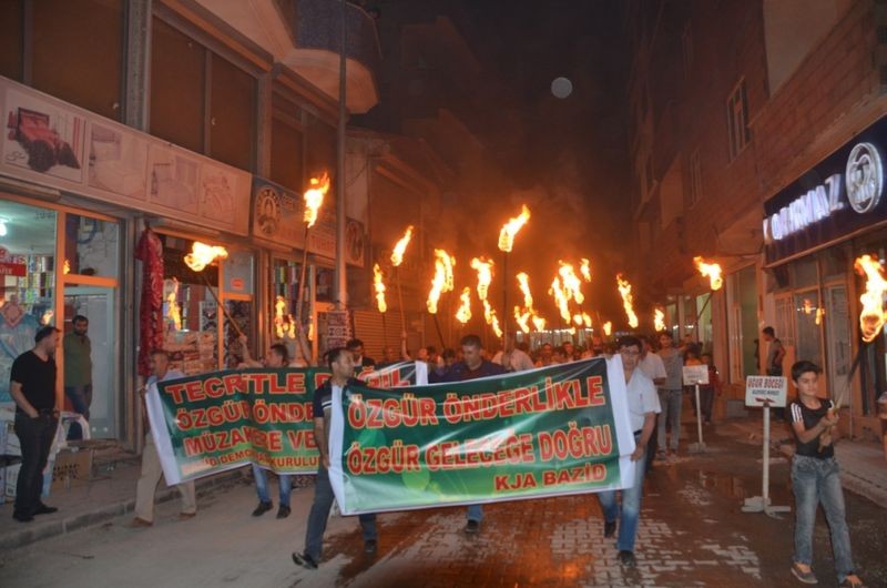 Ağrı’nın Doğubayazıt İlçesi'nde HDP ile DBP üyesi 200 kişilik terör yandaşı grup, 'çözüm sürecinin' devam etmesi ve terör örgütü PKK'nın tutuklu elebaşı Abdullah Öcalan’a uygulandığını ileri sürdükleri tecridin kalkması için meşaleli yürüyüş yaptı.