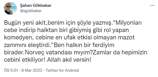 Bugün yeni akit,benim için şöyle yazmış."Milyonları cebe indirip halktan biri gibiymiş gibi rol yapan komedyen, cebine en ufak etkisi olmayan mazot zammını eleştirdi."Ben halkın bir ferdiyim birader.Norveç vatandası mıyım? Zamlar da hepimizin cebini etkiliyor! Allah akıl versin!