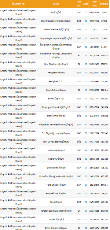 Ahi Evran Üniversitesi 4 yıllık taban puanları 2021, yüzdelik dilimleri ve kontenjan sayıları kaçtır?