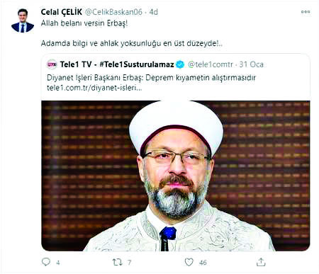 Kemal Kılıçdaroğlu’nun ve CHP’nin avukatı Celal Çelik, Erbaş’ın 10 ay önceki Cuma hutbesinde geçen “Deprem kıyametin alıştırmasıdır” sözlerini yeniymiş gibi gündeme taşıdı. Çelik, “Allah belanı versin Erbaş! Adamda bilgi ve ahlak yoksunluğu en üst düzeyde” diyerek hakaretler savurdu. Alçak paylaşımı amacına ulaşınca Çelik, paylaşımını silerek kaldırdı.